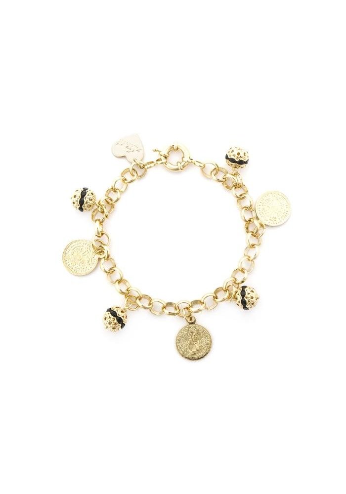 Bracciale in ottone dorato con ciondoli monete e pietre nere.